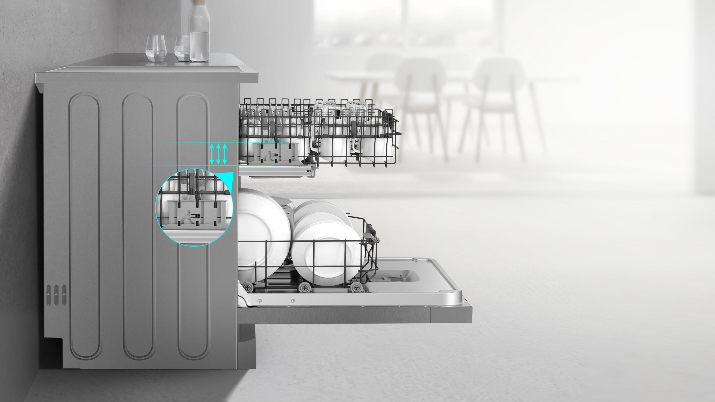 No need to pull it out, the middle basket can be easily lifted higher after loading to provide enough space for even the largest plates and pots in the bottom basket, making this dishwasher truly flexible and easy to use.